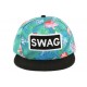 Cette Snapback Swag de marque Hip Hop Honour est look casquette skater et urban wear. La visière est noire et le top est en tissu imprimé de fleurs roses et de feuilles vertes sur un fond bleu ciel. Le front de la snapback est brodé Swag en blanc dans un grand rectangle noir. La taille ajustable de cette casquette se règle par une languette de plastique noir.