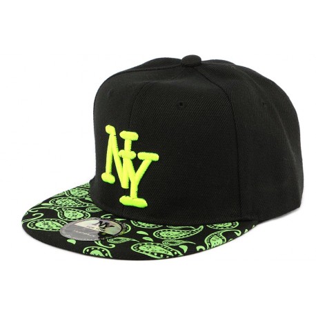 Snapback NY Enfant top noir visière noire et verte graphisme Paisley - Casquette garcon et fille brodée New York Fluo collection Hip Hop Honour