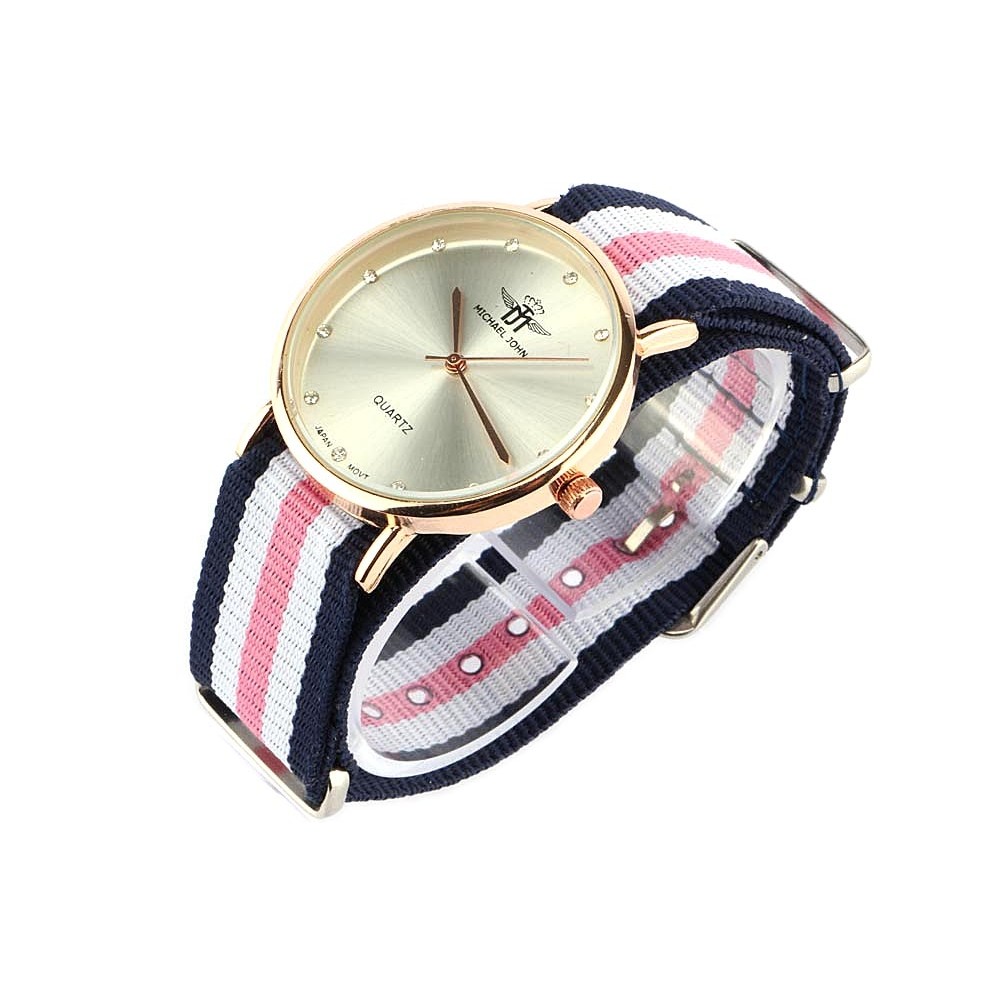 Cette montre femme de marque Michael John présente un bracelet en tissu à lignes rose, blanche et bleue. Le boitier de cette montre fantaisie tendance est rond en métal doré, le fond d'écran est nacré avec des petits strass pour montrer les heures; diamètre 34mm. Le mouvement à quartz est japonais de belle qualité.