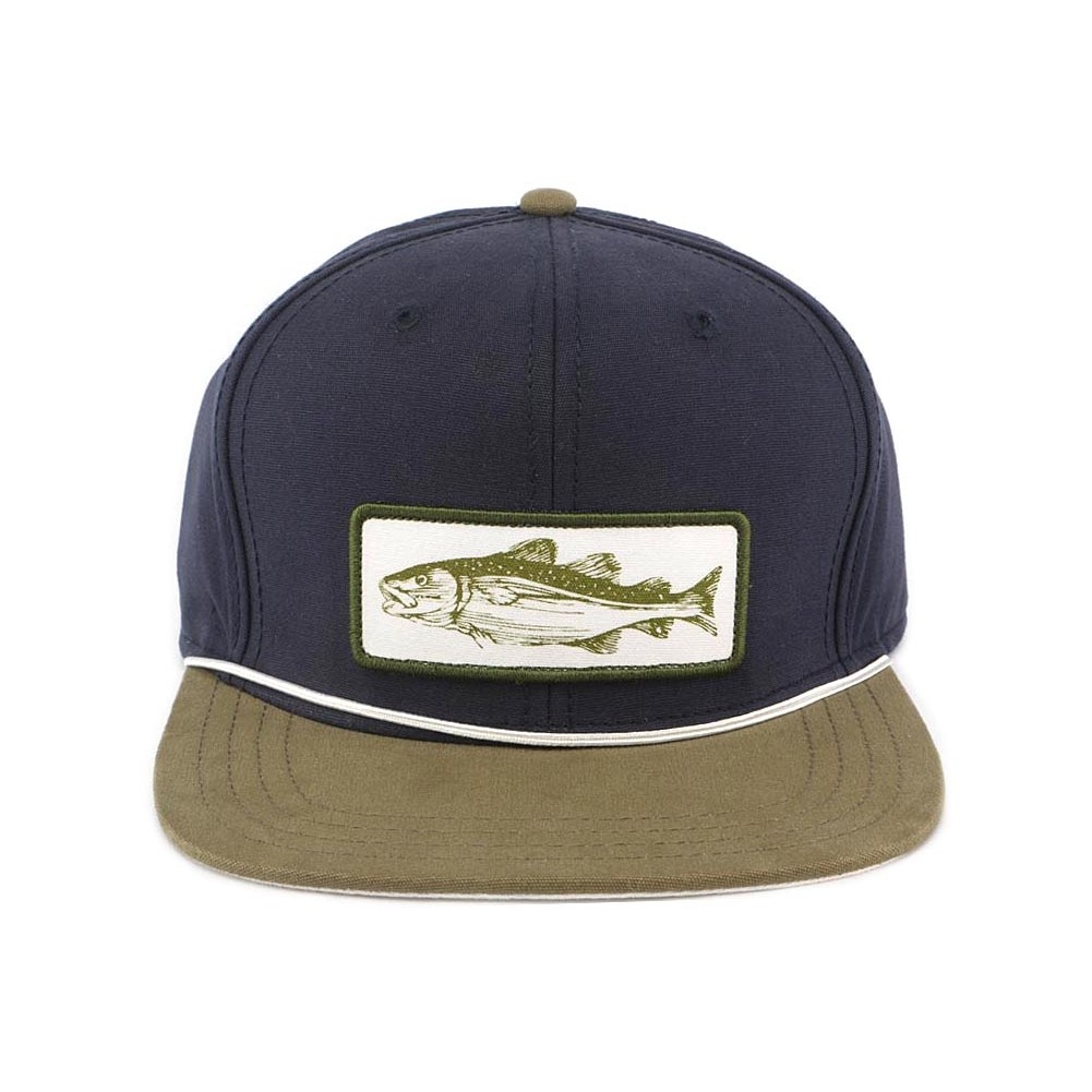 Casquette Snapback de la marque Goorin bros modèle Fish Story, cette snapack est bleu avec une visère Khaki avec un dessous beige, sur le devant nous un galon écru au niveau de la visère, le patch broder sur le devant représente un poisson sur fond beige. A l'arrière nous avons l'attache de réglage pour la taille.