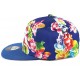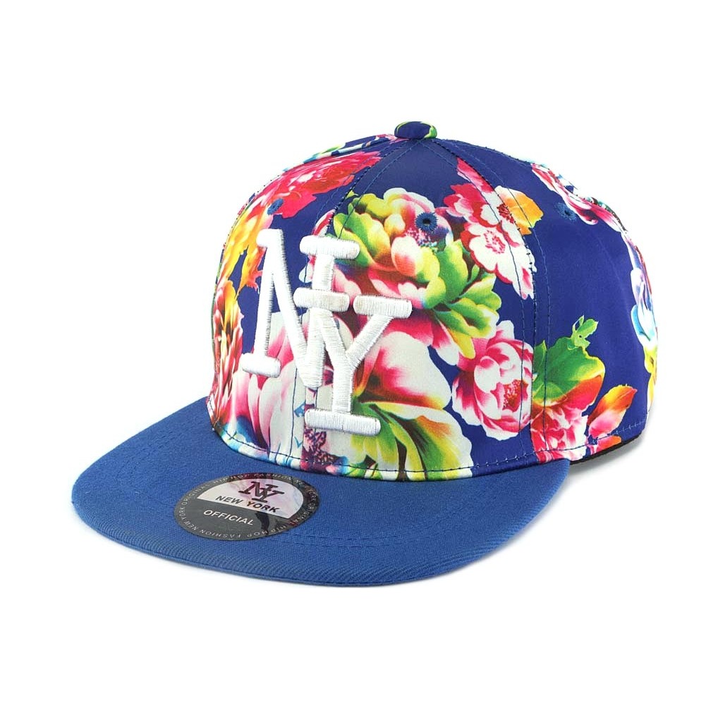 Cette belle Casquette enfant dispose d'une calotte en tissu bleu imprimé de fleurs rouges et jaunes dans une matière douce et brillante. La visisère plate de cette snapback enfant est en toile bleu style gros grain. Sur le top est brodé en 3D le logo NY pour New York en blanc. Cette casquette garçon et fille modèle floral dispose d'une attache d'ajustement de taille et plastique bleu.