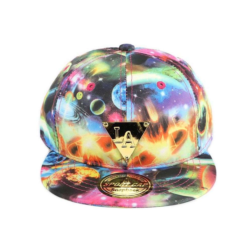 Cette casquette enfant bleu et jaune marque Hip Hop of Honour est style cosmos avec un tissu imprimé de galaxies et de planètes mêlant les coloris jaune, rose, bleu et vet. Un pins LA forme triangle est fixé sur le front de cette snapback fille et garçon. L'autocollant noir et argent Sport Cap Snapback est placé sur la visière plate. Cette casquette fille et garçon est ajustable avec sa languette en plastique rose cousue à l'arrière.