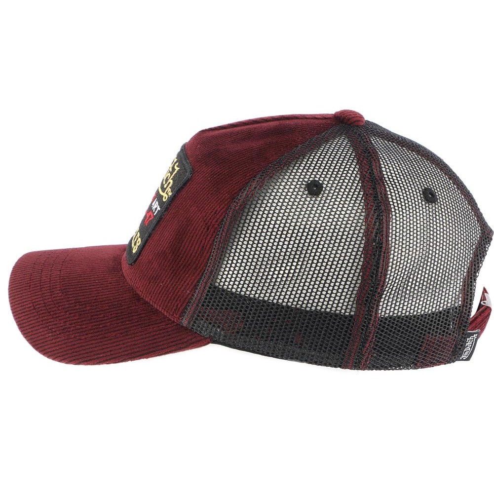 Casquette de la marque Von Dutch modèle Mark, cette casquette curve est en tissu velour rouge bordeaux, sur l'arrière nous avons un filet typique trucker noir. Sur le devant nous avons une visère curve avec sur le top un patch broder Von Dutch type Motorcycles. Sur l'arrière ce trouve la snap de réglage pour la taille.