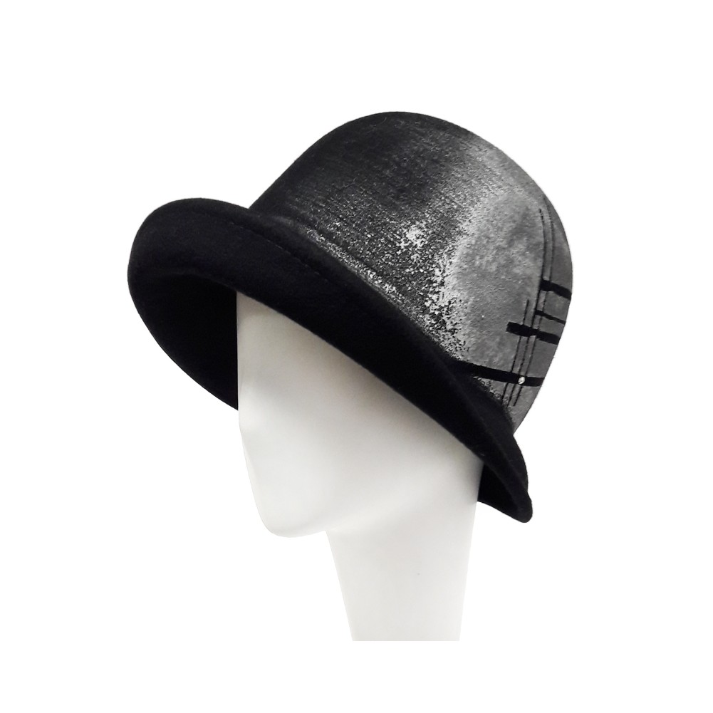 Chapeau forme cloche pour femme de la marque Française Céline Robert modèle Eneko, cette Cloche en feutre de laine noir , peinture blanche ornée de 2 strass. Une forme rétro très profonde permettant de vous protéger du froid hivernal.98% feutre de laine , 2% coton, elle est imperméable. Fabrication Française.