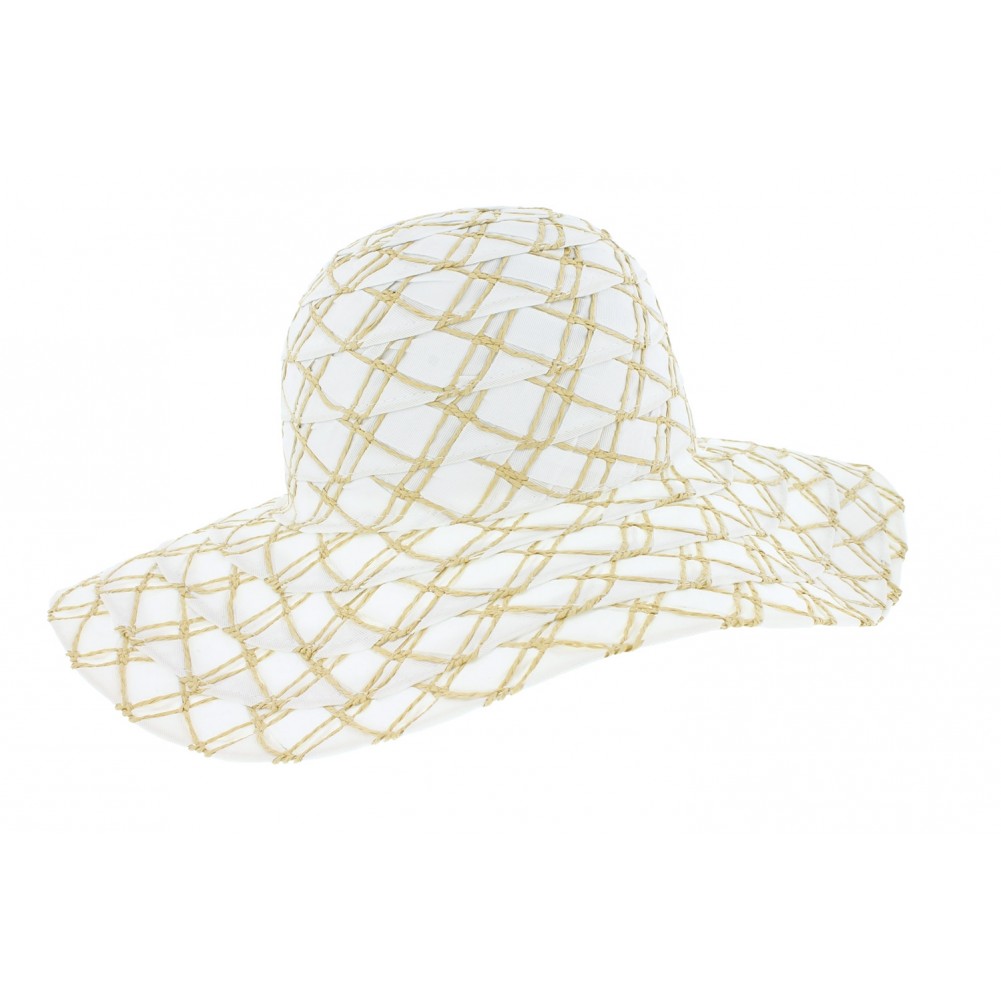 Couleur été et mode chic, cette capeline paille marque Herman Headwear est en tissu blanc. Look créateur, ce chapeau femme été est fond blanc avec un damier double de cordelette de paille couelur naturelle qui recouvre la calotte et la lame. Mode fantaisie, cette capeline été sera l'accessoire décontracté chic pour la city comme pour la plage.