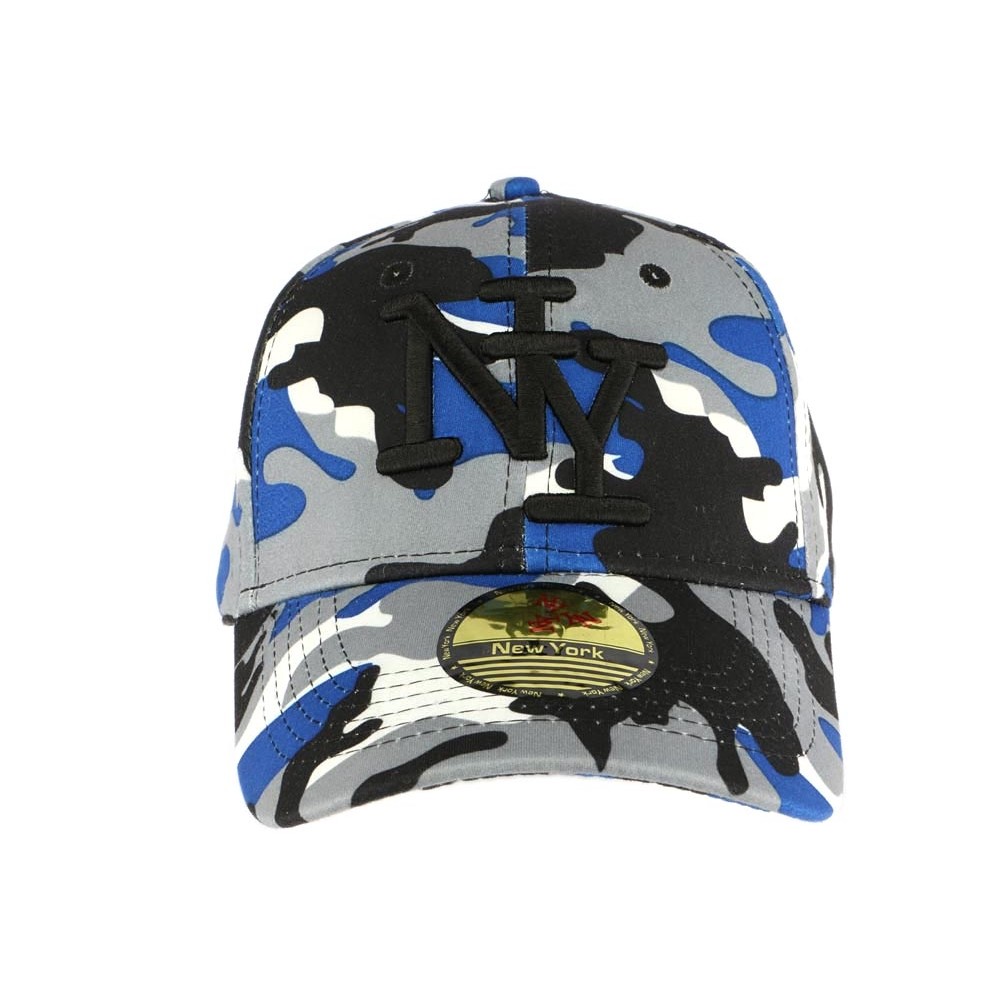 Casquette forme baseball de la marque Hip Hop Honour modèle Essaouira, cette casquette baseball est en tissu camouflage grand branchage bleu, gris et noir. Sur le devant on trouve une visère curve avec un logo broder noir NY. A l'arrière nous avons une attache de réglage pour la taille.