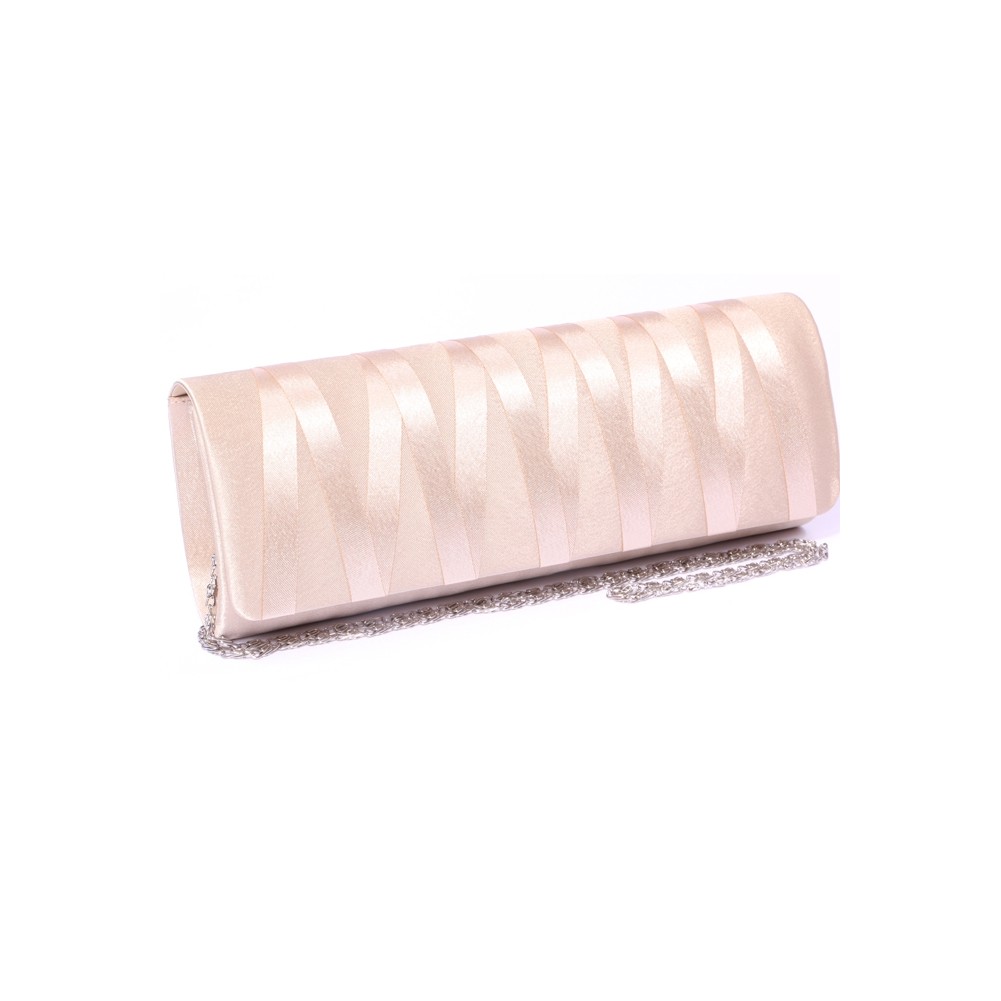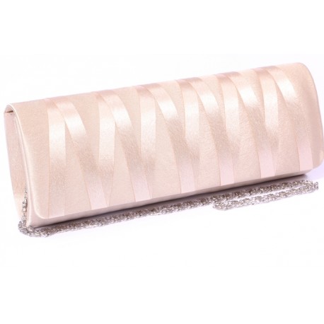 Pochette de soirée modèle Natacha sélection Léon Montane. De forme allongée et ovale, cette pochette mariage montre un dessin d'entrecroisements ton sur ton d'un ruban de satin brillant. Disposant d'un chainette détachable et doublée de satin camel, elle est d'une finition très soignée. Elle pourra aussi bien vous acompagner lors d'une cérémonie qu'en mode ville version classe.