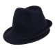 Chapeau femme en Feutre taupé bleu marine asymétrique. Travaillé sur la base de la forme du Fedora, pour un masculin/féminin à porter au quotidien. Une bande en taupé est cousue sur le côté avec un relevé. 100% taupé. La couleur bleu marine est très lumineuse et facile à assortir avec vos tenues. Fabrication Française.