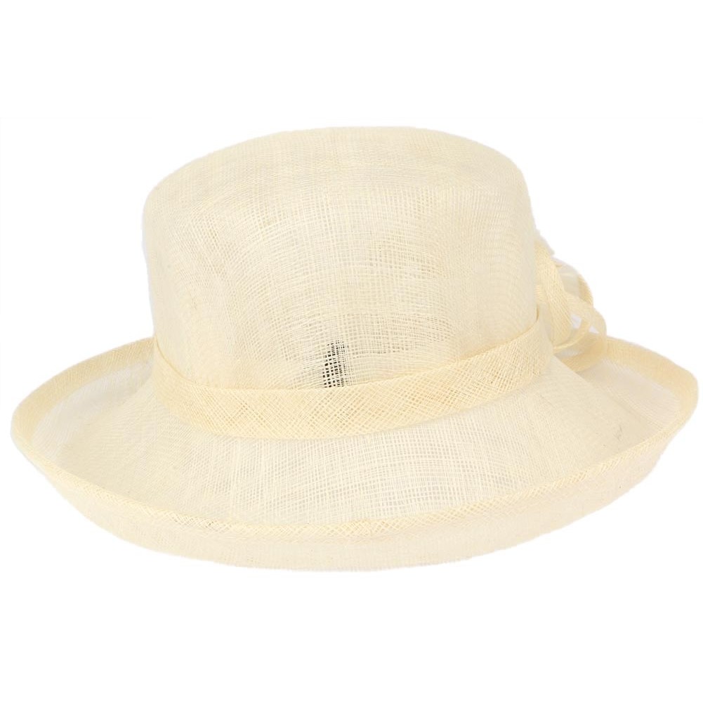 Chapeau de mariage de la marque Léon Montane modèle Donna en sisal écru, cette petite capeline en sisal dispose d'un bord légèrement relever pour laisser voir les yeux. Sur le coté nous trouvons une décoration de plume et de sisal avec un tour de calotte en sisal. Taille unique.