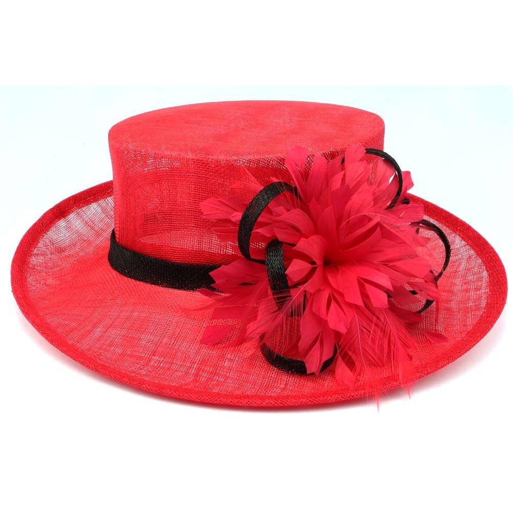 Chapeau de mariage de la marque Léon Montane modèle Livia, cette capeline mariage est en sisal rouge et noir. Ce chapeau dispose d'un bord asymétrique. Sur le coté nous trouvons une fleurplume avec des liens de sisal. Cette capeline sera votre touch chic pour vos mariages. Taille unique.