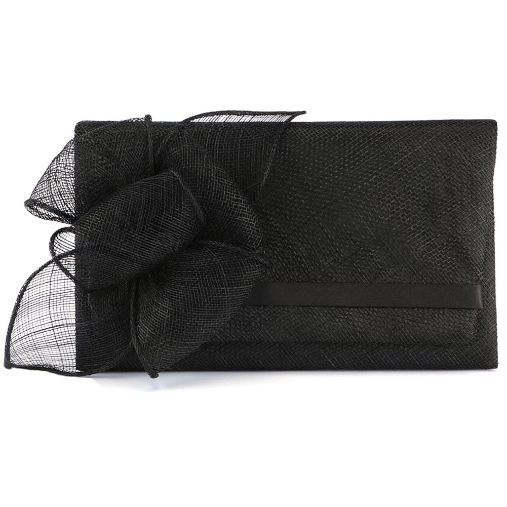 Belle pochette de soirée noire en paille de sisal ornée d'une fleur et d'un ruban satin, pochette mariage Femme tendance et classe Alyxe collection Léon Montane. Taille: 23*13*6 cm