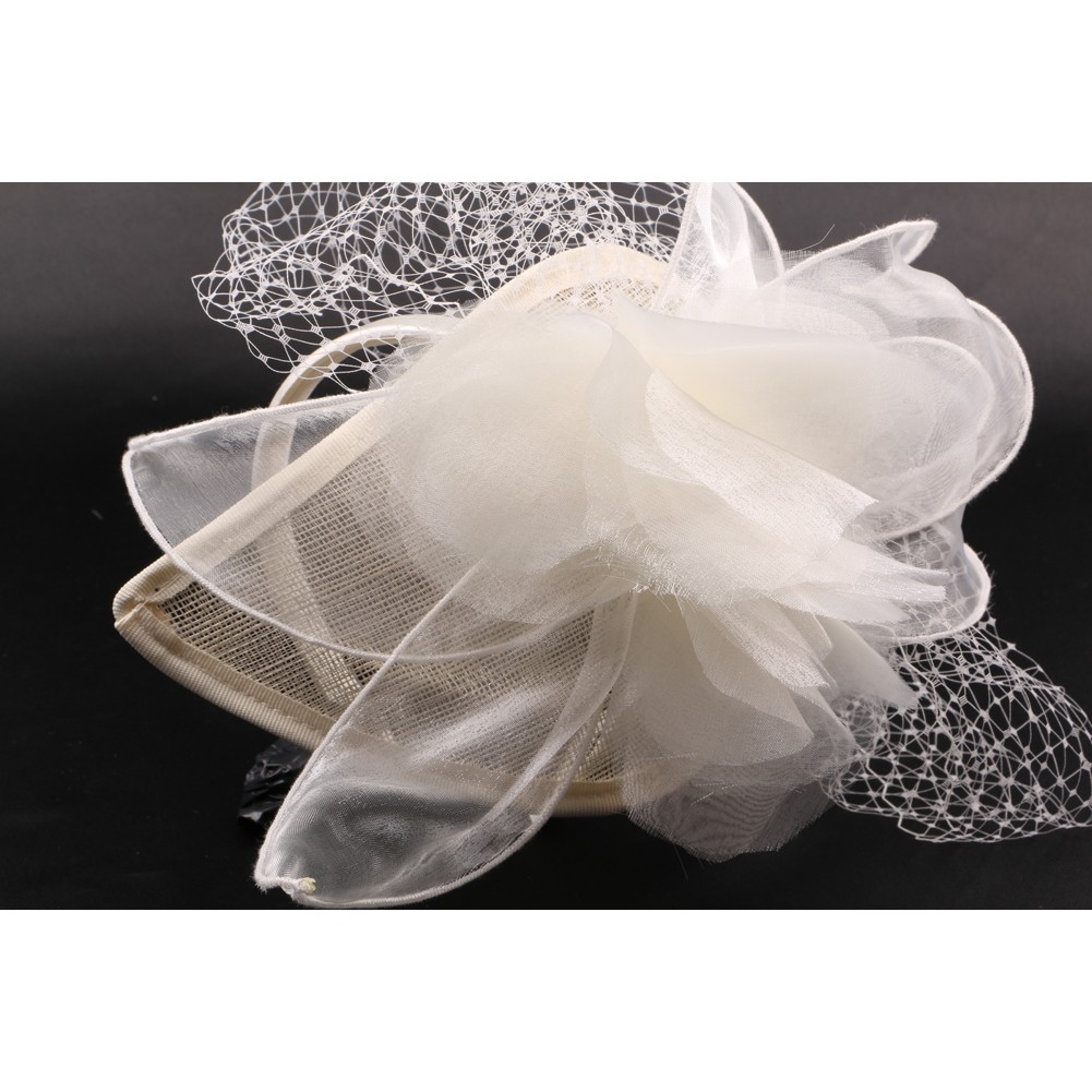 Coiffe de mariée de la marque Nyls Création modèle Aline garni de voilette et d'organza. Cette coiffe sera parfaite pour remplacer un chapeau mariage.