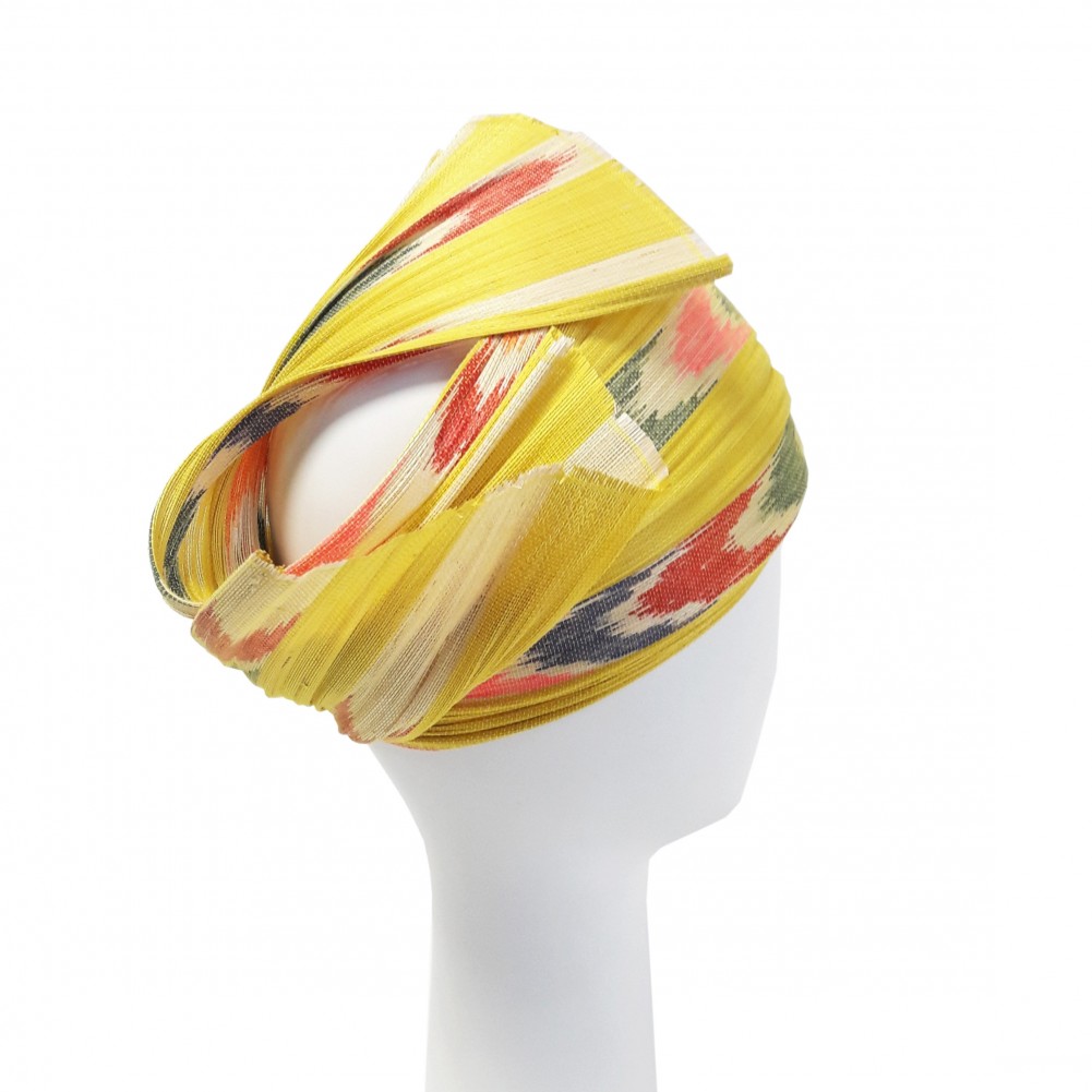 Turban jaune en fibre naturelle ( fibre buntal, fibre de cactus ). Ce turban modelé à la main formant presque une coiffure, peut se porter à la fois avec le relevé sur le devant ou sur l'arrière. Son motif, un clin d'œil aux imprimés des tissus Wax, est graphique et original. Ce mélange de couleurs entre le jaune, le vert mousse, l'orange, le corail et le brique, permet d'assortir ce chapeau avec des tenues de différentes couleurs. Sa forme est parfaitement modelée pour une tenue confortable, à porter sans modération ! Fabrication Française. 100% abaca