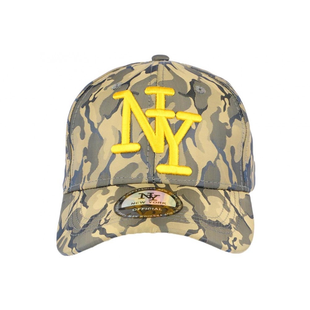 Casquette NY militaire jaune et verte tissu brillant fashion référence Kaptain par Hip Hop Honour, casquette baseball camouflage femme et homme visière curve et sticker NY Official argenté.