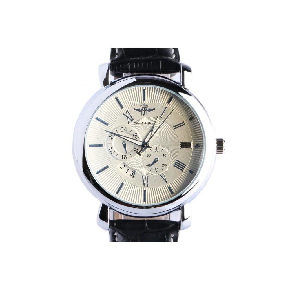 Bracelet montre cuir noir esprit classe boitier métal argent ecran beige travaillé modèle Astex marque Michael John, montre dateur homme avec écrans chronographes factices et verre bombé, diamètre 45 mm, boitier inoxydable, mécanisme à quartz japonais.