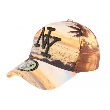 Casquette Baseball orange et bleue fashion et fantaisie été référence Tropical Night Bitter collection Hip Hop Honour, casquette NY femme et homme en tissu imprimé de palmiers vue sur mer dans une plage idyllique au doux coucher du soleil, visière courbée et sticker New York.