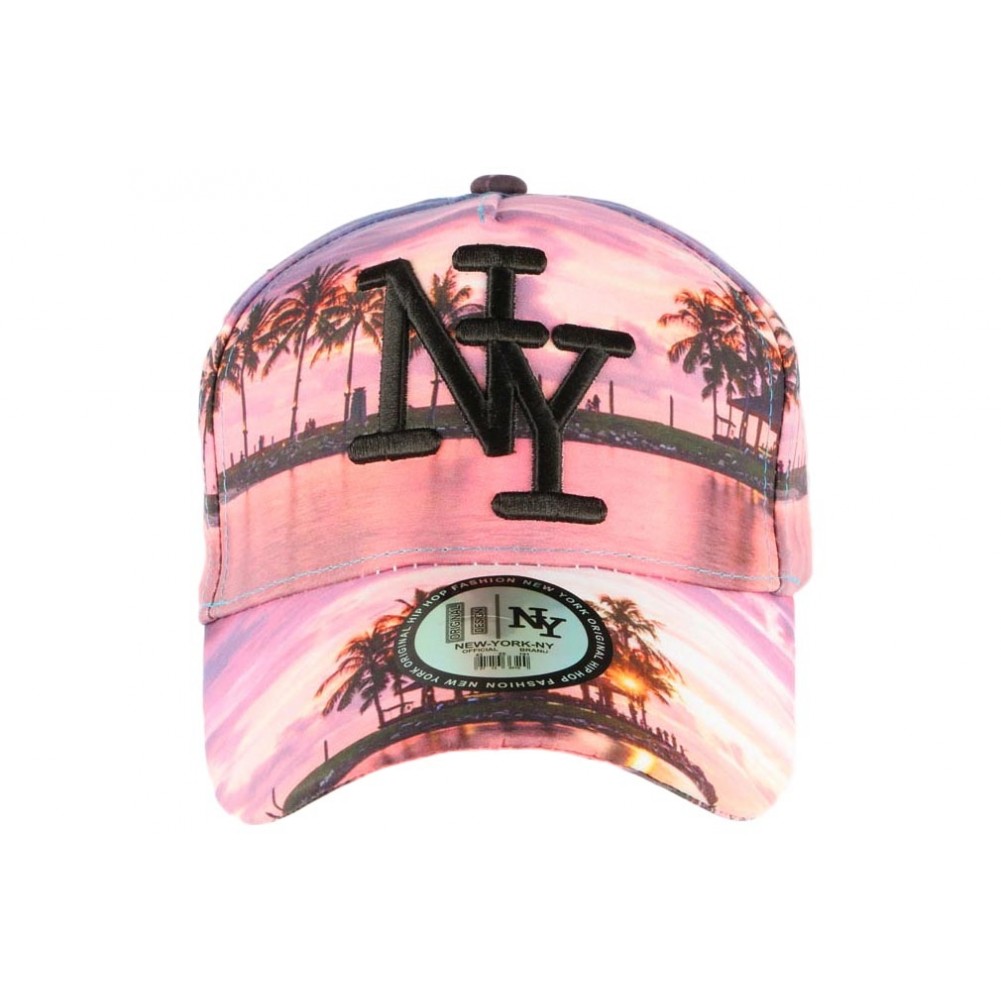 Casquette Baseball Rose et violette fashion et originale mode été référence Tropical Night Pinky sélection Hip Hop Honour, casquette NY femme et homme en toile imprimée de palmiers ambiance vue sur mer fantaisie dans une plage Caraibe au beau coucher du soleil, visière curve et sticker New York.