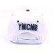 Casquette Snapback YMCMB Blanche. La casquette présente un top blanc brodé YMCMB bleu marine à l'avant. La visière rappelle le drapeau américain avec les lignes blanches et rouge et ses étoiles blanches sur fond bleu. La taille de la snapback se règle classiquement avec son snap plastique blanc.