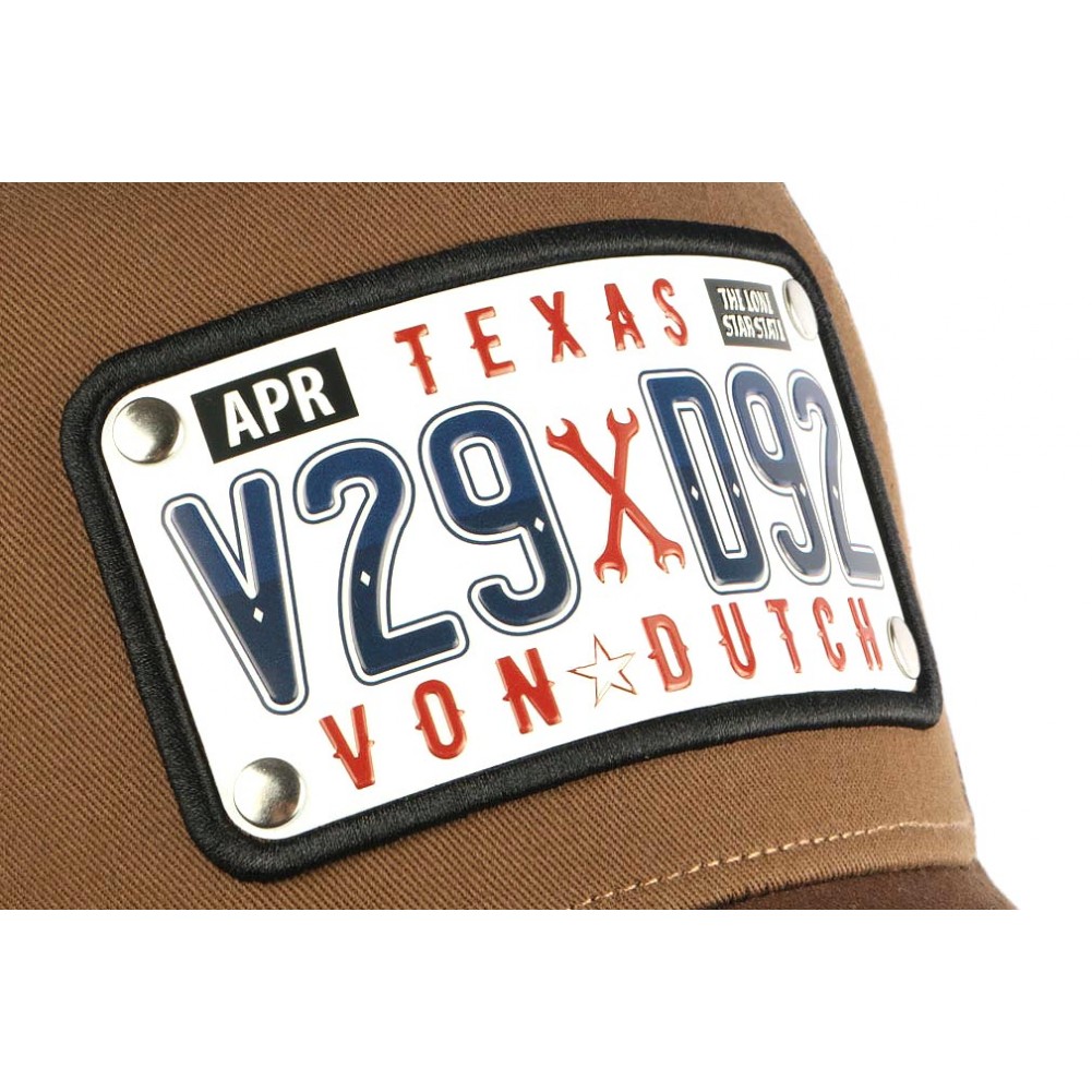 Choisir une casquette baseball Von Dutch marron modèle Texas Brown, casquette filet homme et femme design fashion avec plaque minéralogique USA Texas V29D92, visière courbée marron, filet noir, style vintage USA.