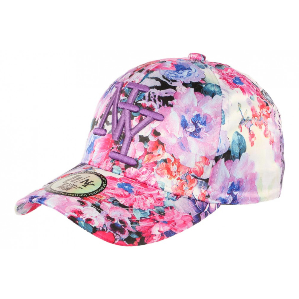 Choisir une casquette baseball violette à fleurs dans un graphisme fashion rose et blanc référence Spring Purple présentée par Hip Hop Honour, casquette NY femme et homme look floral tendance été avec visière curve tendance et sticker NY Original.