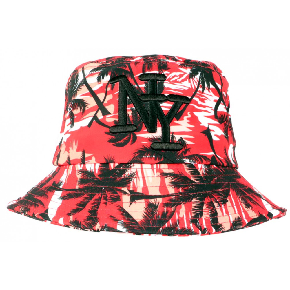 Acheter un chapeau bob NY homme et femme rouge palmiers et plage tropicale mode streetwear référence Red Hawaï proposée par Hip Hop Honour, chapeau bob pas cher look été fashion et cool, léger et confortable.