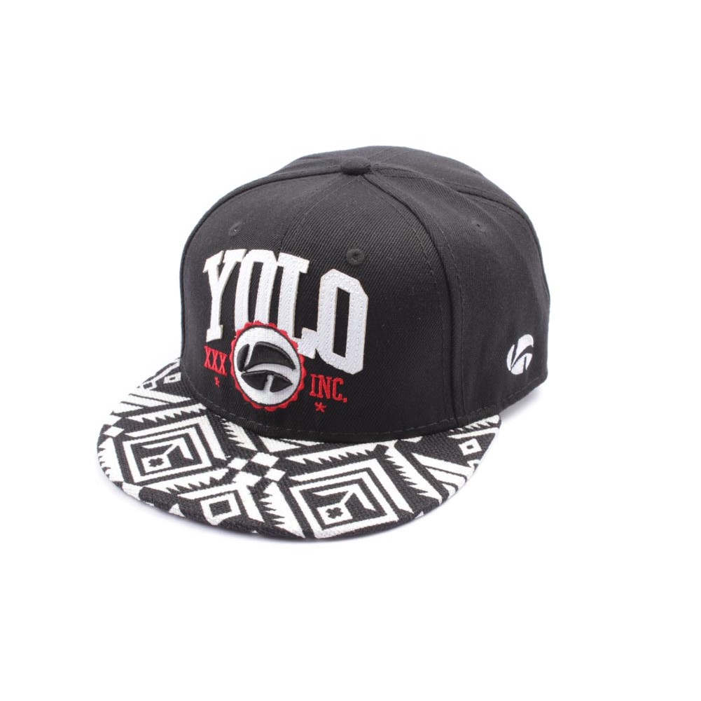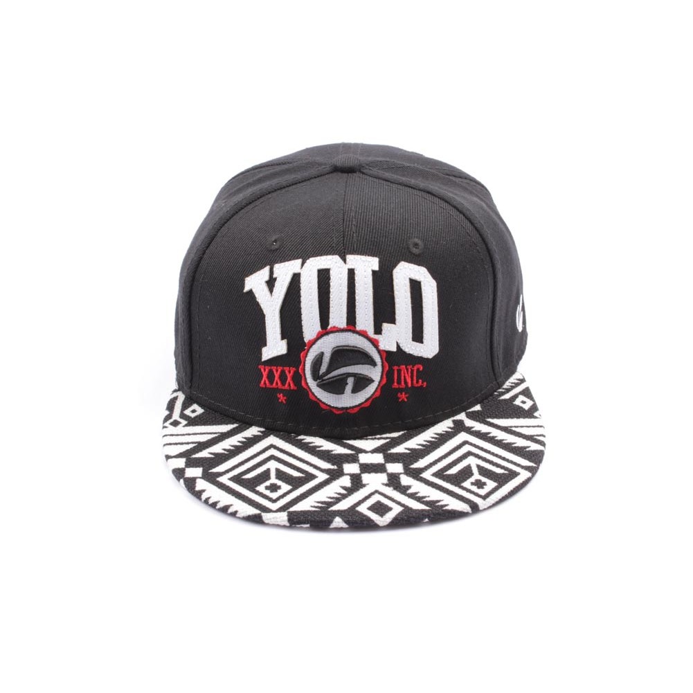 Casquette Snapback de la marque Landtaylor Noire avec la visière imprimée façon géométrique blanche, à l'arrière on trouve l'attage de réglage.