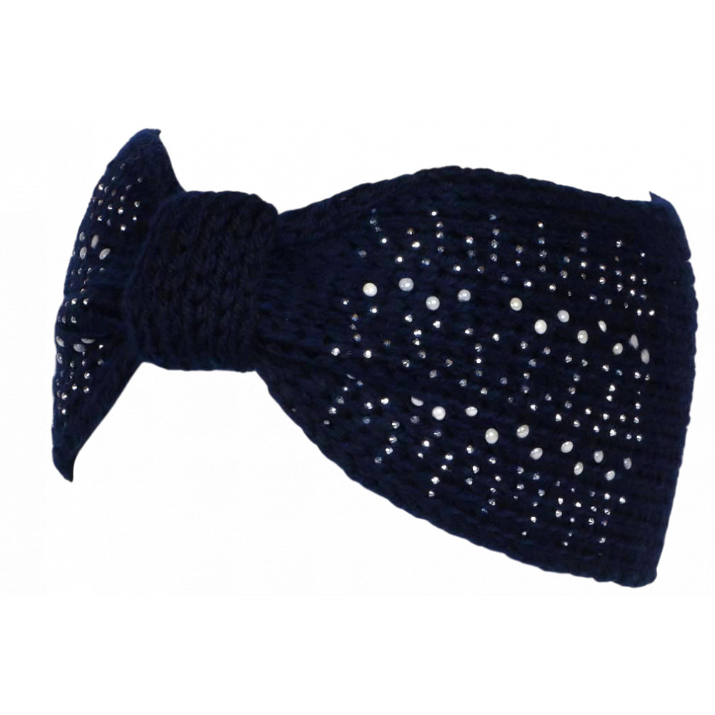 Achetez en ligne bandeau femme strass bleu marine en laine douce et souple pour un confort classe et lumineux modèle Navy Merry marque Nyls Création, bandeau cheveux laine bleu marine avec perles et strass design en noeud chapelier tendance et chic pour un hiver mode. Headband strass pas cher taille unique fibres extensibles.