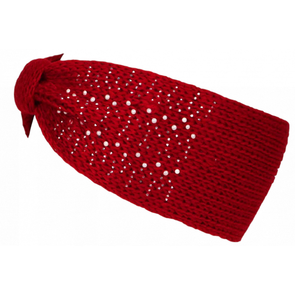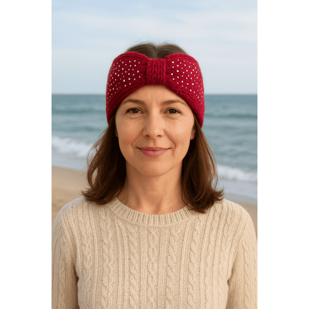 Achetez en ligne un bandeau femme strass rouge en laine douce et souple pour un confort classe et lumineux modèle Red Merry de la marque Nyls Création, bandeau cheveux laine rouge avec perles et strass design en noeud chapelier tendance et chic pour un hiver mode. Headband strass pas cher taille unique fibres extensibles.