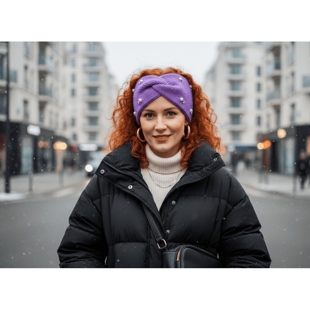 Chic et tendance : Un bandeau pour femme violet orné de perles et de cristaux pour ajouter une touche de glamour à vos tenues hivernales.