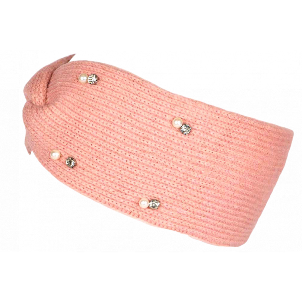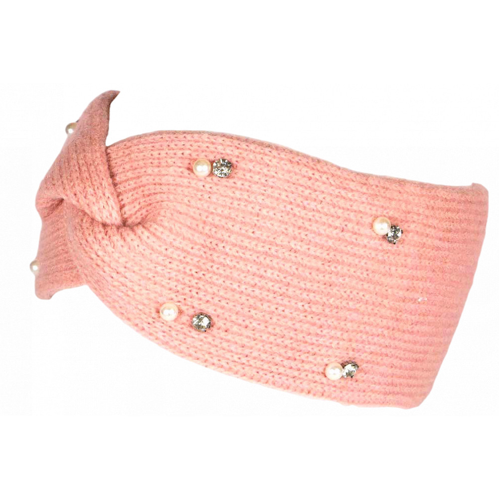 Vente en ligne le bandeau femme permet et cristaux rose en laine douce et souple pour un confort classe et lumineux modèle Pinky Merry de marque Nyls Création, bandeau cheveux laine rose avec strass et perles brillantes design en noeud chapelier tendance et chic pour un hiver mode. Headband perles pas cher taille unique fibres extensibles.