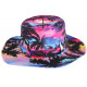 Vente en ligne Bob ficelle bleue et rose tropical print original de palmiers sur une plage au soleil couchant esprit Caraïbes par Nyls Création collection Heartbreaker, chapeau bob homme et femme en toile souple cousu d'un large bord et d'un cordon de serrage, taille adulte.