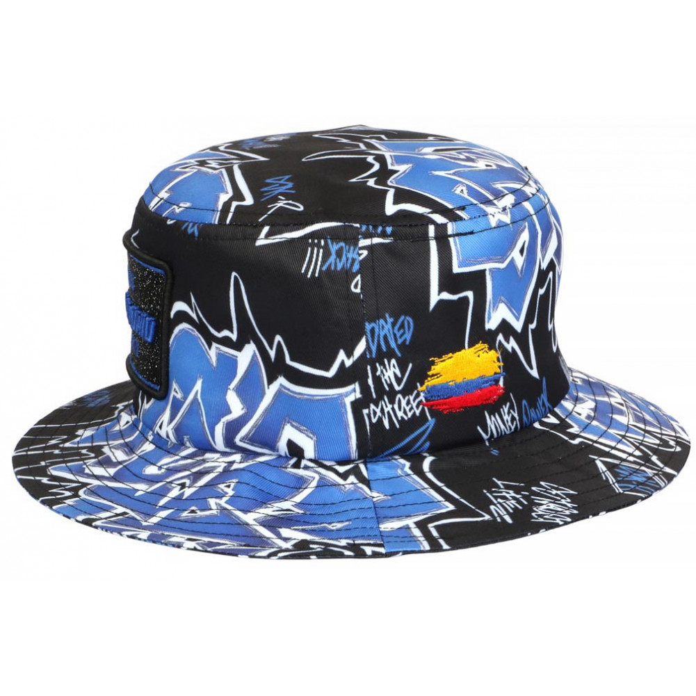 Acheter un bob Plata o Plomo noir et bleu design streetwear tagué city fun pour un look fashion, chapeau bob plata o plomo femme et homme de marque SKR esprit Pablo Bad Boys City, gros écusson Plato o Plomo bleu en 3D avec strass paillettes, taille unique adulte.