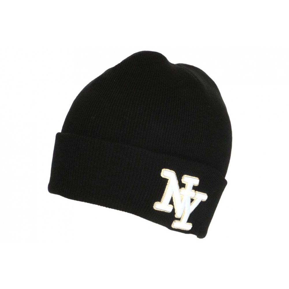 Design streetwear hiver, Choisir un bonnet NY homme et femme tricoté de fines mailles de laine confortable en douce acrylique noire pour supprimer les démangeaisons. Look épuré avec un coloris contrasté et chaud, ce joli bonnet New York pas cher propose la broderie cousue 3D du NY en doré et blanc pour un relief tendance et une réalisation prestige. Ce bonnet revers noir et doré est confectionné en tricot de points à motifs Jersey qui confèrent une bonne souplesse pour un doux confort. Création Hip Hop of Honour référence Gold Farzy, cet accessoire headwear hiver sera un bon compagnon pour vous accompagner dans toutes vos sorties hivernales city ou fashionSnow