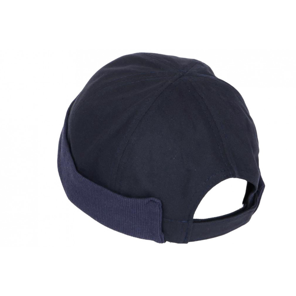 Vente en ligne bonnet marin bleu foncé en toile souple et douce pour un look tendance modèle Navy Keroet marque Nyls Création, bonnet docker homme et femme pas cher pour une mode simple et sympa. Ce bonnet miki en tissu marine est ajustable par une ceinture scratch.
