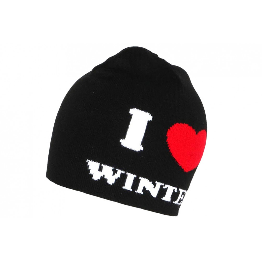 Acheter bonnet noire femme et homme original de marque Nyls Création. Style fashion et fantaisie pour ce bonnet coeur femme et homme en laine noir douce et chaude 100% acrylique. Ce joli bonnet court original montre le dessin d'un coeur rouge avec I (love) Winter. Mode classe et fantaisie, ce bonnet coeur noir est un accessoire headwear au look affirmé et efficace.