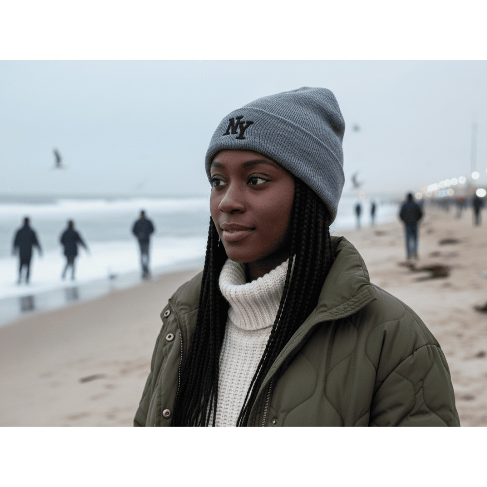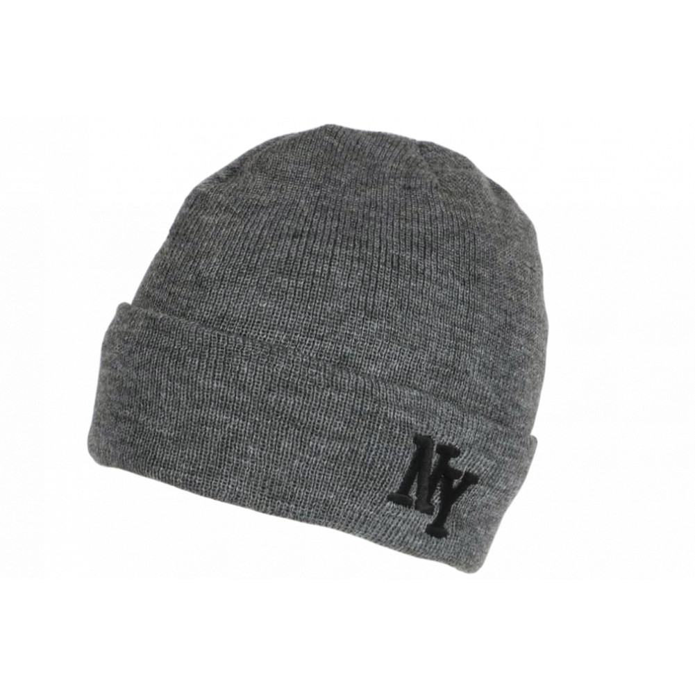 Vente en ligne un bonnet New York Gris en laine à revers fines mailles souples, broderie New York noire modèle Silver Aurora marque Nyls Création, bonnet NY femme et homme mode headwear streetwear avec doublure en polaire chaude et confortable. Beanie NY gris clair tendance et classe confortable et facile à porter.