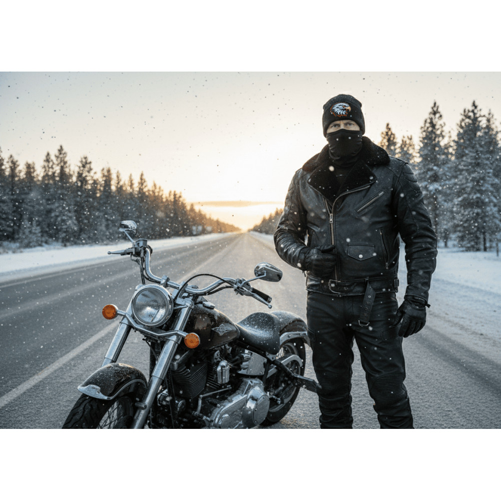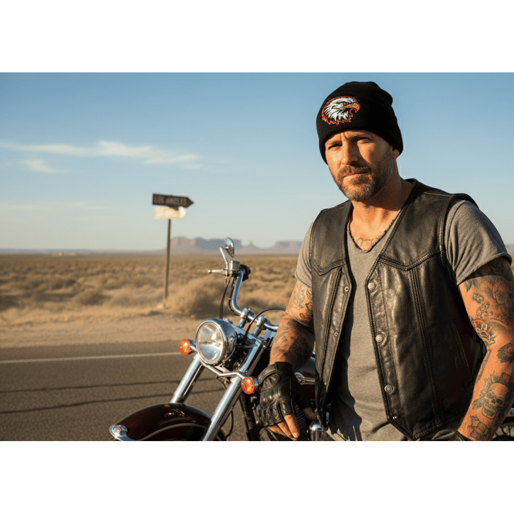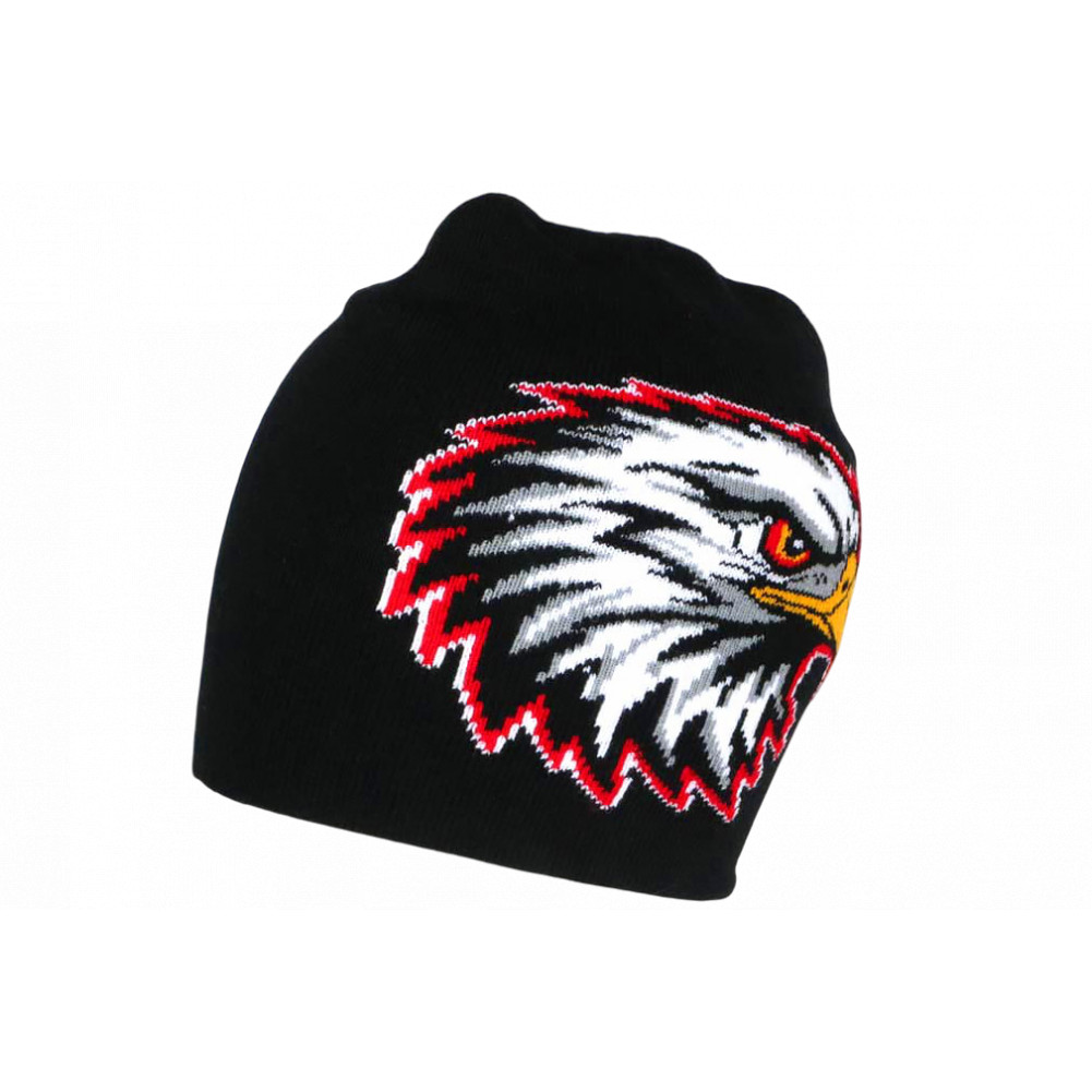 Acheter Bonnet aigle noir design motard USA hot road en laine douce au design d'un aigle pygargue américain rouge et blanc avec son bec recourbé jaune, bonnet biker homme et femme pas cher chaud et doux pour un hiver fashion et hot road.