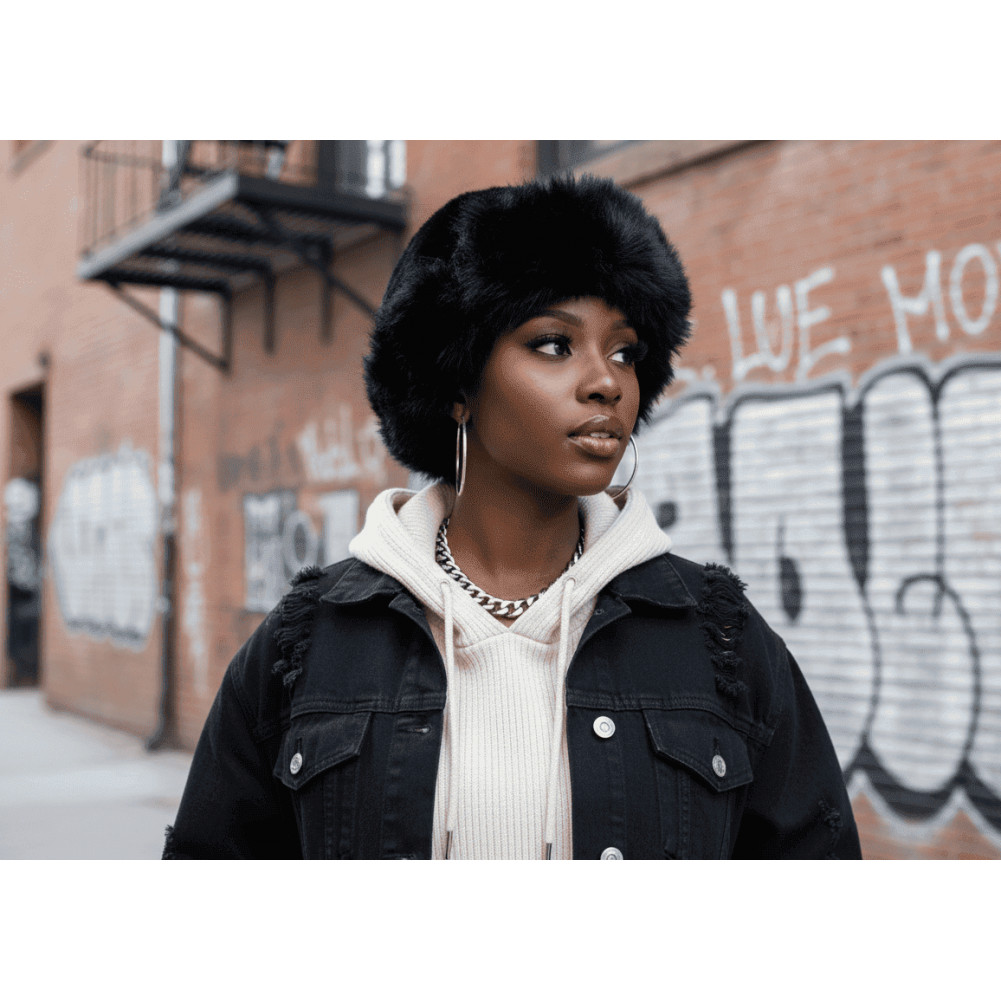 Achetez une toque fourrure noire chaude avec doublure en plaire douce pour un hiver chic modèle Black Masha marque Nyls Création. Chapeau femme en fausse fourrure pour un d’hiver chaud et élégant, doux et confortable. Bonnet fourrure pas cher design chic avec bord large mode cocooning au féminin.