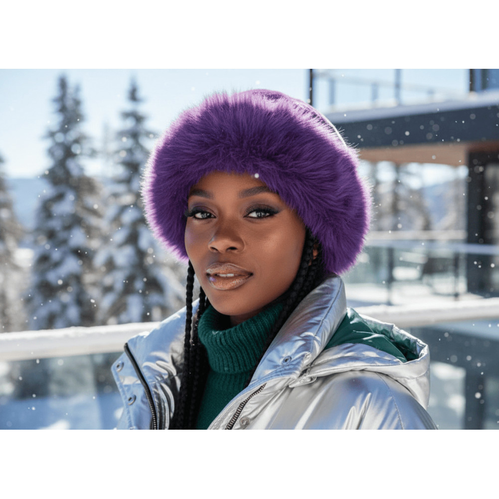 Idéale pour les journées froides, cette chapka fausse fourrure chaude se porte avec un manteau de laine, une doudoune chic ou même une veste de ski pour un style chapeau fourrure violette moderne et élégant.