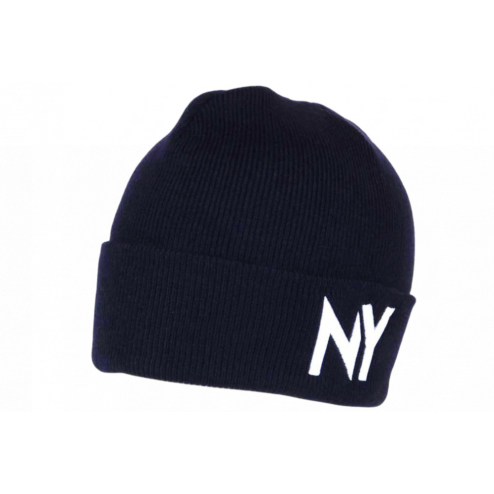 Achetez un bonnet New York Bleu Marine logo blanc en relief design streetwear modèle Navy Yrton de marque Nyls Création, bonnet NY homme et femme en laine design fashion, tricot souple en fines maille de laine pour un confort chaud et classe, bonnet streetwear pas cher en laine acrylique.