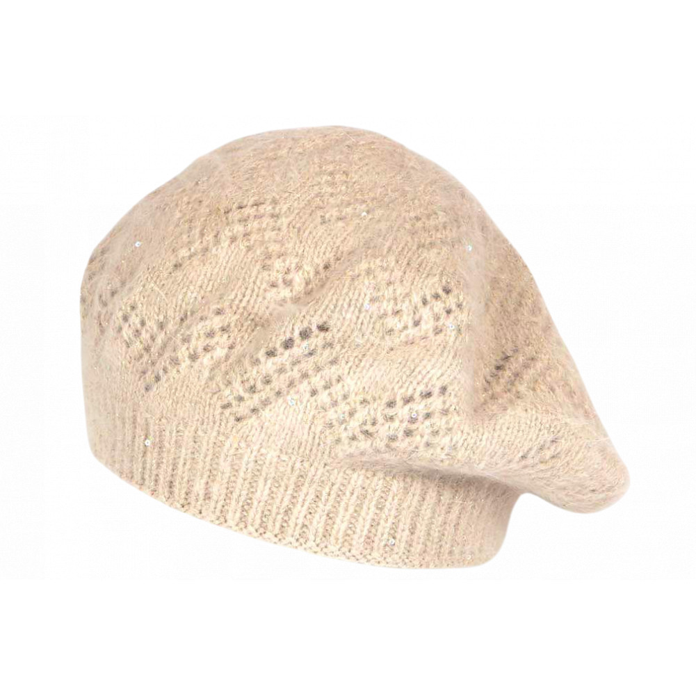 Achat bonnet laine angora beige classe design paillettes tricot en jersey ajouré et volutes aux fines mailles souples confortables modèle Sand Angiola de marque Nyls Création, béret beige pour femme pas cher en laine angora douce pour une mode hiver tendance et prestige, belle fabrication chapelière tradition, diamètre du disque (extérieur) 29cm.