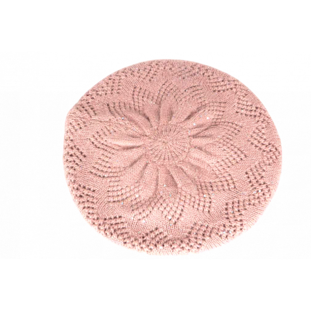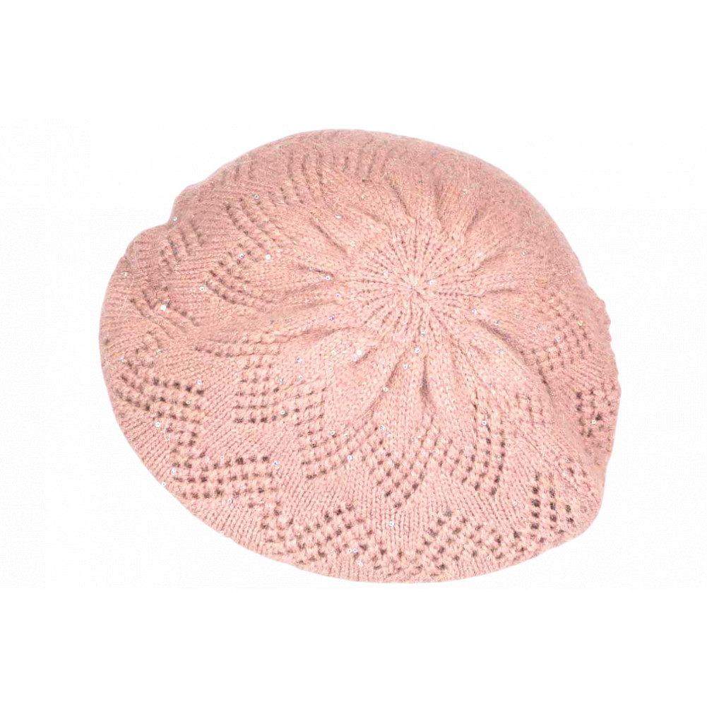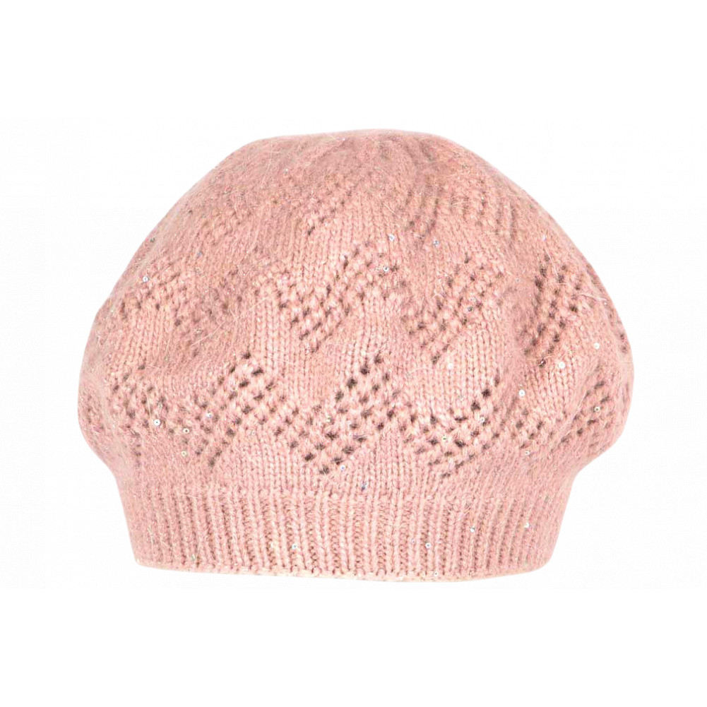 Vente en ligne bonnet laine angora rose classe design paillettes tricot en jersey ajouré et volutes aux fines mailles souples confortables modèle Pink Angiola de la marque Nyls Création, béret rose pour femme pas cher en laine angora douce pour une mode hiver tendance et prestige, belle fabrication chapelière tradition, doublure en polaire, diamètre du disque (extérieur) 29cm.