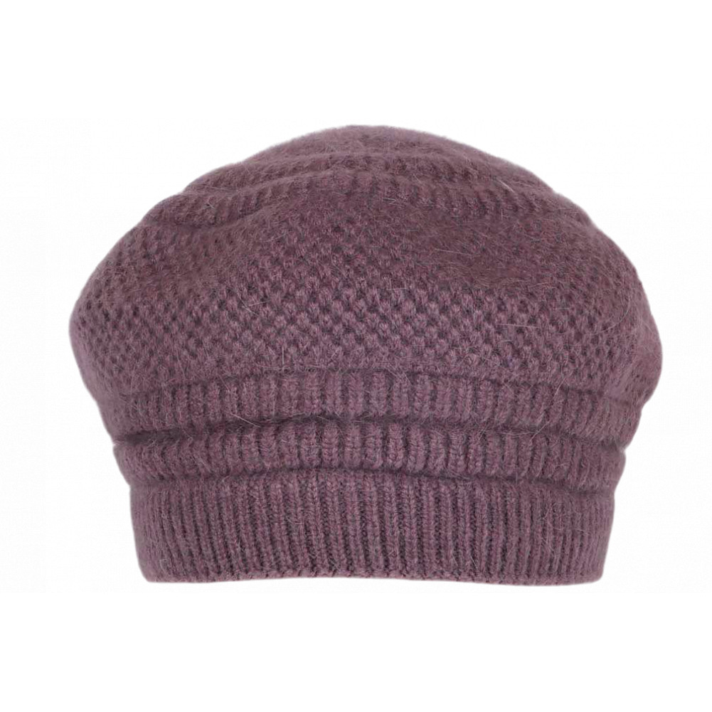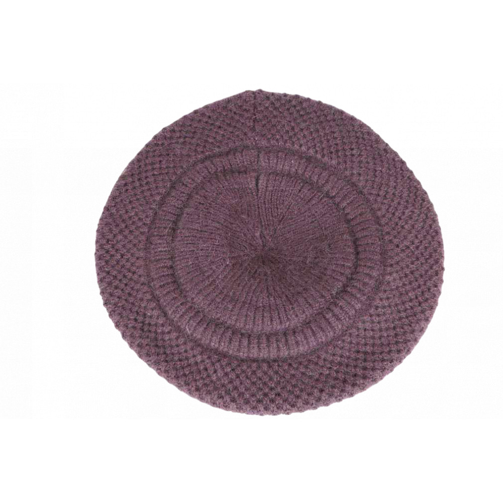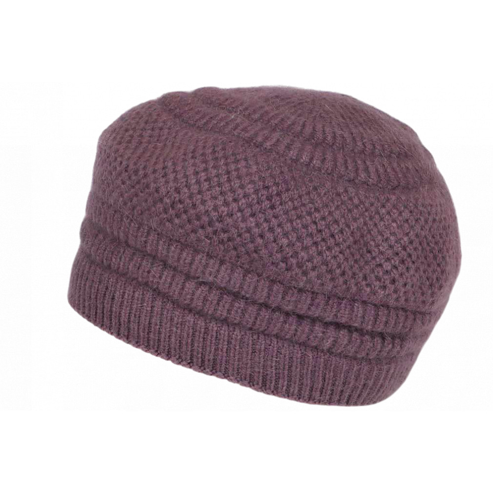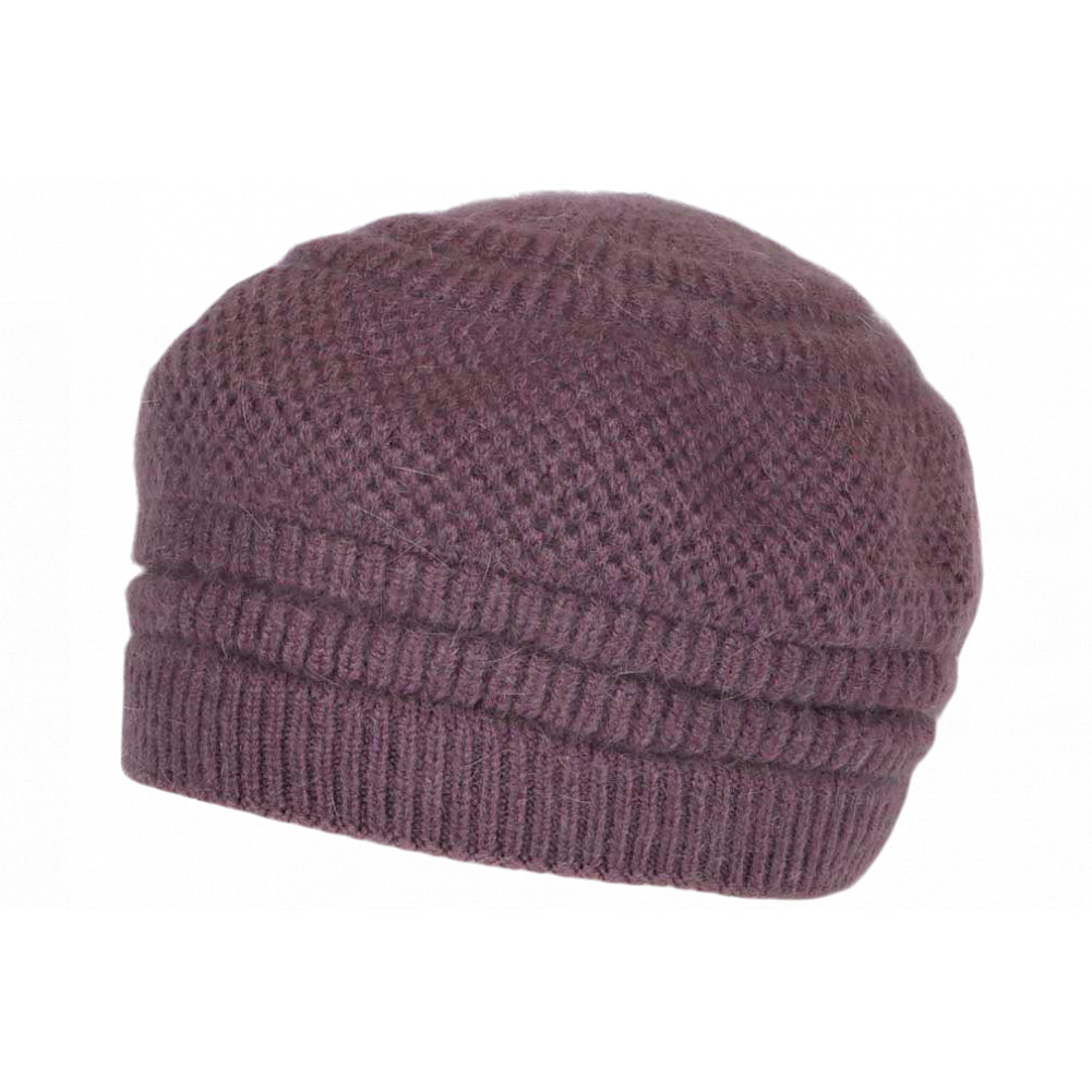 Découvrez le bonnet angora violet classe design volutes et nid d'abeilles avec belles mailles souples confortables modèle Purple Angyla de la marque Nyls Création, béret violet femme pas cher en laine angora douce pour une allure hiver tendance et prestige, doublure en polaire plush épaisse, belle fabrication chapelière tradition, diamètre du disque à plat 26 cm.
