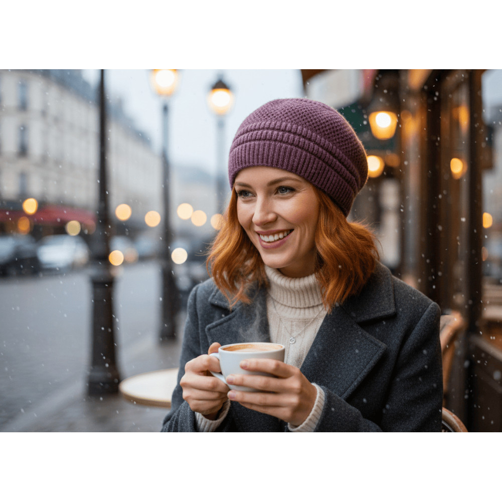 La forme unique de ce modèle oscille entre le bonnet traditionnel et le béret moderne violet en angora. Ce mélange subtil apporte un volume élégant, légèrement arrondi, qui valorise la silhouette sans alourdir le visage. Cette double identité bonnet-béret permet de l’associer facilement à une multitude de styles : une tenue du quotidien casual, un look féminin chic, un ensemble urbain moderne ou même une silhouette plus raffinée. Il s’agit d’un accessoire polyvalent, capable de s’adapter aussi bien à une garde-robe classique qu’à des vêtements plus tendance.