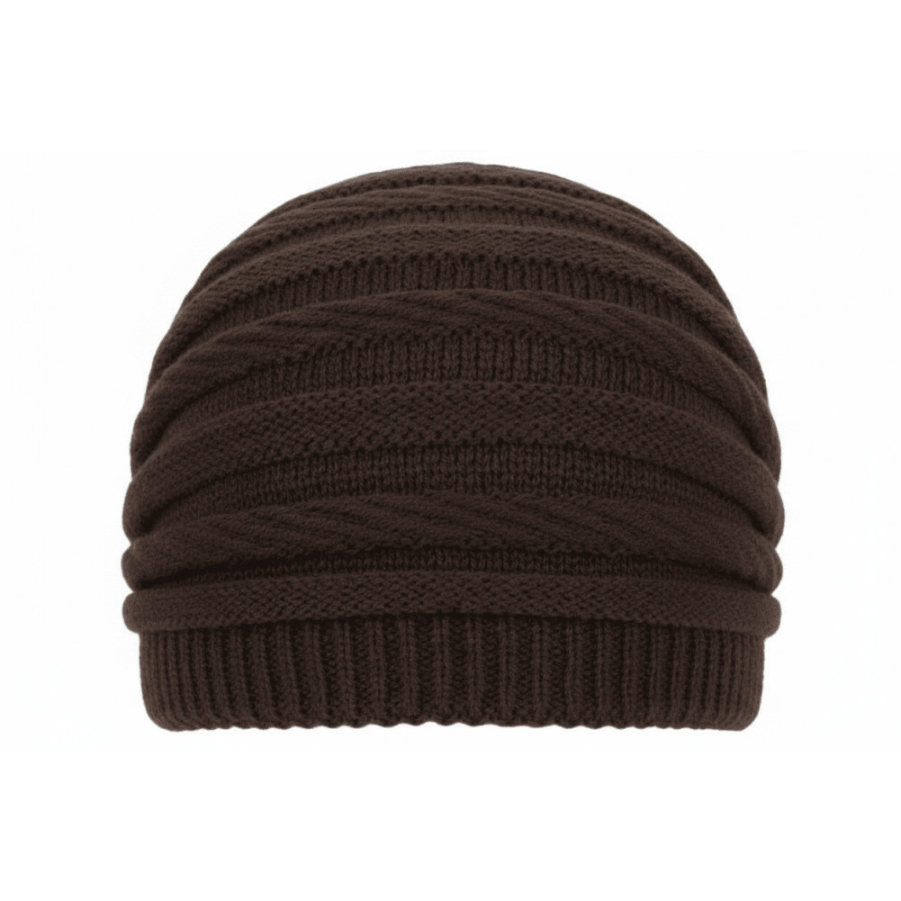 Vente bonnet long marron foncé en laine douce et confortable modèle Choco Jack de la marque Nyls Creation, bonnet rasta chocolat homme et femme pas cher motifs de mailles torsadées et volutes, style tendance et cool pour un look hiver décontracté.