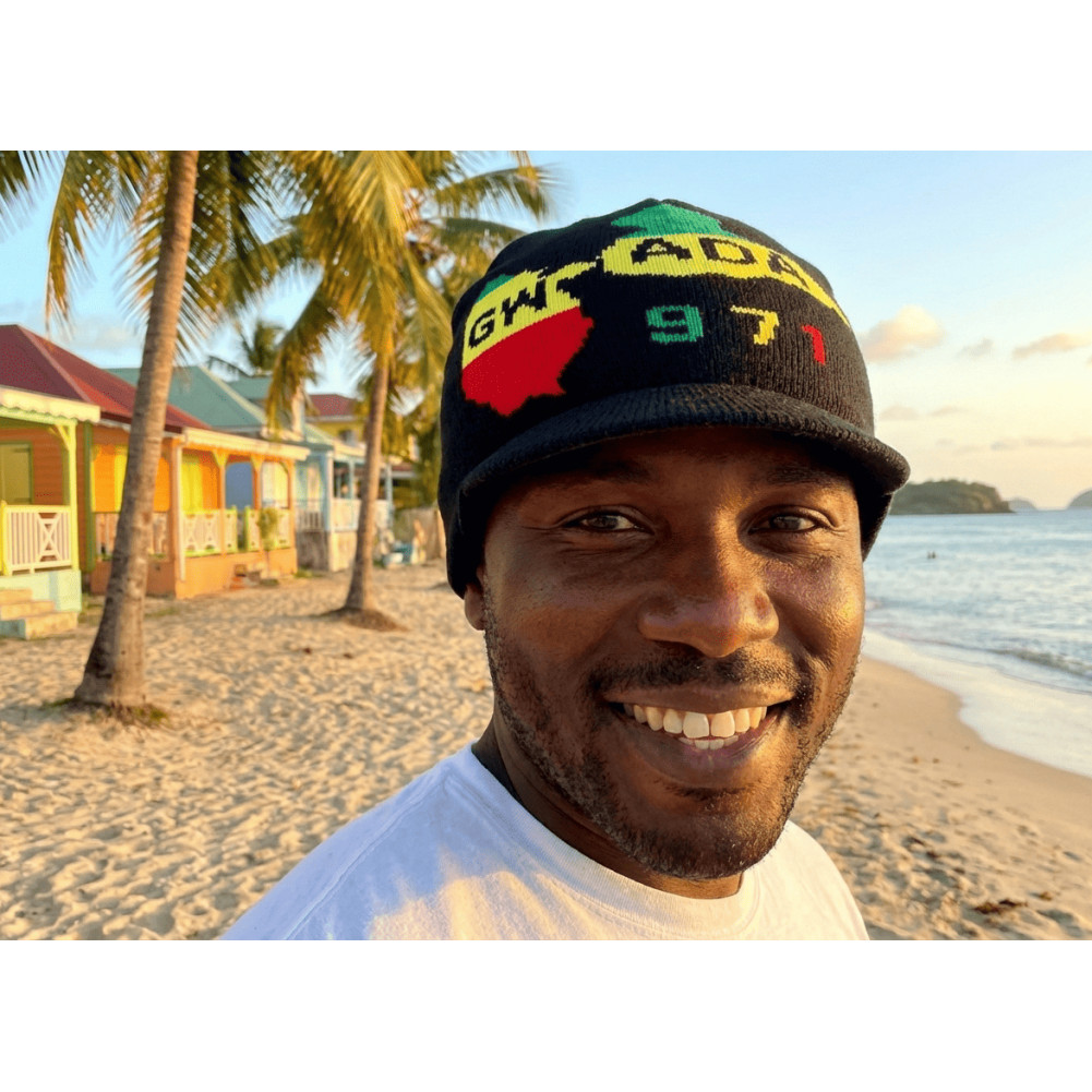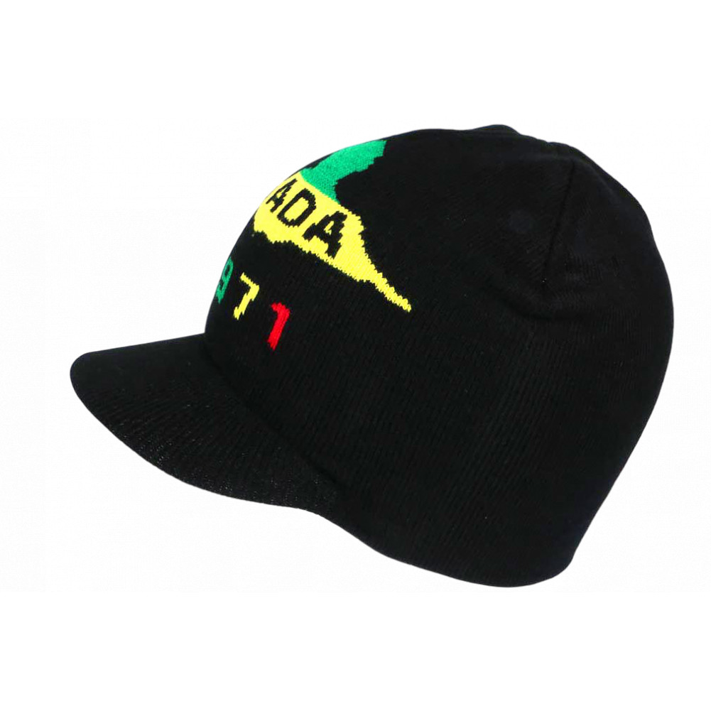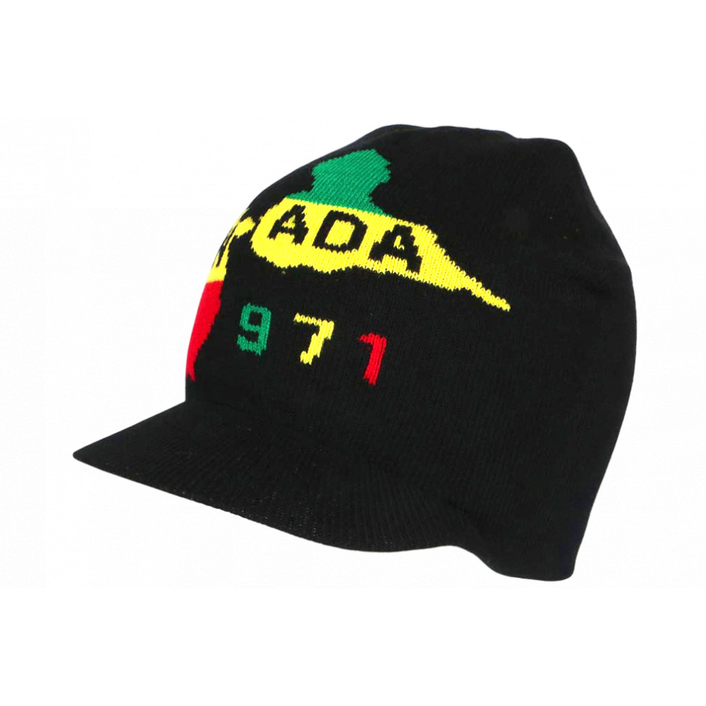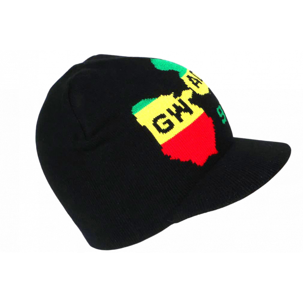 Vente en ligne bonnet casquette Guadeloupe Noir avec 971 et dessins de haute terre et basse terre sur fond noir, bonnet 971 Gwada en laine acrylique douce pas cher aux couleurs Rasta pour une mode cool, fashion et affirmée, bonnet court noir taille unique.