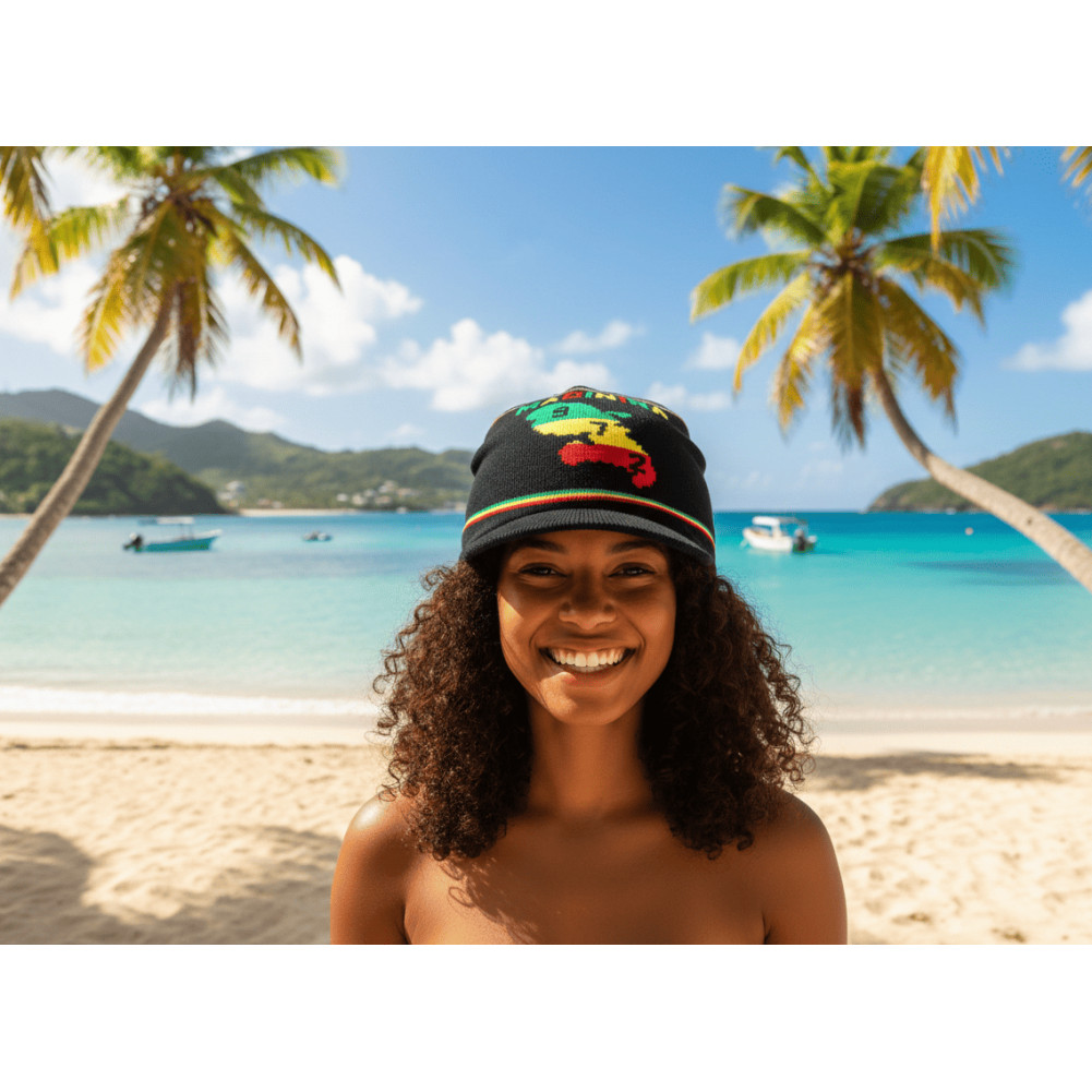 Look fashion et coloré, vente en ligne bonnet Martinique noir fabriqué en laine acrylique douce et confortable pour le porter sans sensations e picotements. Côté style, ce bonnet casquette Martinique pas cher tendance affiche le dessin de l'ile de la Martinique aux coloris rasta vert jaune et rouge avec le célèbre 972 de code postal. Ce joli bonnet visière ile de la Martinique homme et femme vous assurera un style efficace et assumé pour un hiver cool.
