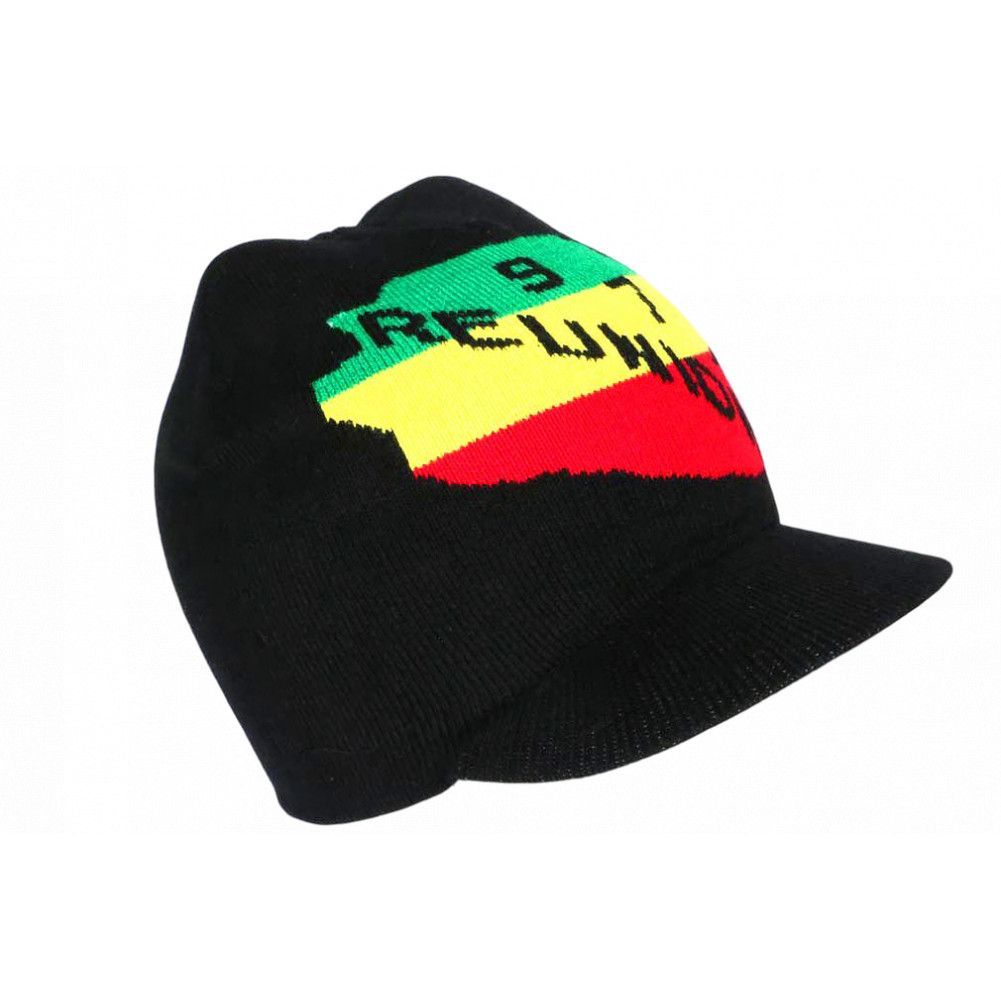 Achetez en ligne un bonnet visière La Réunion noir dessins de l'île Intense pour homme et femme, bonnet casquette 974 réunionnais au look rastafari Vert Jaune Rouge en laine blanche de marque Nyls Creation