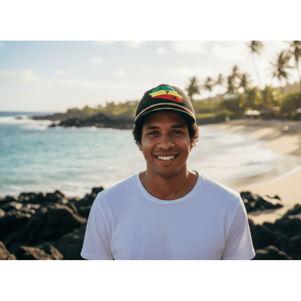 Vente bonnet casquette La Réunion noir dessins de l'île Intense pour homme et femme, bonnet casquette 974 réunionnais au design rastafari Vert Jaune Rouge en laine blanche de la marque Nyls Creation