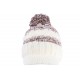 Choisir un bonnet casquette femme et homme en laine tricot blanc et marron modèle Galyx White de la marque Nyls Creation, bonnet visière blanc à pompon et grand revers, doublé en tissu polaire plush épais, style fashion et tendance hiver décontracté et contemporain au chaud.
